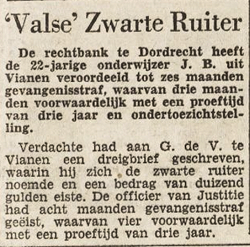 Dat De Zwarte Ruiter, zijn daden, zijn eerste arrestatie, zijn ontsnapping, zijn veroordelingen en zijn tweede arrestatie nieuws van nationaal belang was, had ook een neveneffect. Hij was beroemd en berucht. Anderen trachten mee te liften op zijn beruchtheid en gaven zich voor hem uit. Er zijn verschillende ‘valse’ zwarte ruiters geweest die probeerden hem te kopiëren of die, gebruik makend van zijn naam, slachtoffers geld afhandig wilden maken, zoals uit het krantebericht hiernaast blijkt. |