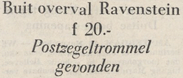 Het ging mis op 15 november 1954 op het postkantoor in Ravenstein.Met een brandstichting in een boerenschuur in Neerlangel had De Zwarte Ruiter de politie weggelokt. Hij wachtte bij het postkantoor in Ravenstein tot de postbestellers naar huis waren. Toen hij daarna, met een doek voor zijn gezicht, geknield voor de brandkast van het postkantoor zat, kwam de beheerder, de heer J. van Dieten, binnen. Toen gebeurde er Iets wat nog niet eerder gebeurd was, er viel een schot, en de volgende dag stierf de beheerder aan de verwondingen in zijn buik. En waarvoor uiteindelijk. In het geldkistje dat De Zwarte Ruiter had meegenomen zat maar 10 gulden en enkele postzegels. Die 10 gulden bleken later in het proces belangrijk, want in de krant had gestaan dat er twintig gulden in het kistje zat, maar De Zwarte Ruiter wist dat het er maar 10 waren. Zo’n tragedie als deze overval, had Brabant, ja heel Nederland, nog nooit meegemaakt! De kranten stonden er in heel Nederland vol van. U kunt dat zien aan de koppen die u op deze pagina aantreft.De Zwarte Ruiter leek helemaal door te draaien in de laatste weken van 1954. In de oudejaarsnacht stal hij vierduizend gulden uit de kluis van de pastorie van Volkel. Op weg naar huis schepte hij op de weg tussen Boekel en Gemert, enkele minuten voor twaalf uur, de 22 jarige fietser Bart van Eenbergen uit Uden. Deze overleefde het ongeluk niet. De Zwarte Ruiter reed door, maar de politie vond de dag daarna de beschadigde auto in zijn garage. Er zat niets anders op dan weg te vluchten uit Mierlo Hout. In de eerste dagen van 1955 pleegde hij nog wat overvallen en diefstallen met name in Noordoost en Midden Brabant. Waarbij hij op de avond van 5 januari enkele schoten loste met een stengun of pistool op een man die hem achtervolgde nadat hij een mislukte poging gedaan had diens auto te stelen in TIlburg. Gelukkig raakte hierbij niemand gewond. Vervolgens reed hij op een (natuurlijk gestolen) fiets naar Goirle, waar hij in een villa inbrak en daar een fles sherry buitmaakte. Terug in Tilburg besloot De Zwarte Ruiter opperwachtmeester Schuurmans in Mierlo-Hout te bellen en die te vertellen dat het slecht met hem ging. Schuurmans had altijd begrip getoond voor Hans. Hij adviseerde hem om zich maar aan te geven omdat er toch geen kans op ontsnappen zou zijn. Hans kon zich daarin niet vinden, want hij reageerde met "Als ik weer de cel in moet dan wordt ik helemaal gek". Op 6 januari werd hij toch gearresteerd in Hotel Schuermans aan de Spoorlaan in Tilburg. De eigenaar van het hotel had hem herkend aan de hand van een signalement in de krant en de politie gewaarschuwd. |