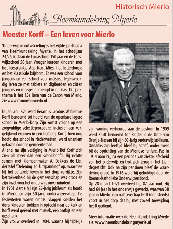 In de canon van Mierlo uit 2022 wordt de geschiedenis van Mierlo en Mierlo-Hout beschreven in 28 items. Het 15e item heeft dezelfde titel als het jaarthema van 2025. Dus daar zullen we dit jaar bij aansluiten. Wil je lezen wat er in de Canon van Mierlo over onderwijs te lezen is dan kan dat via de website van de Canon of in het themanummer van de Koerier.