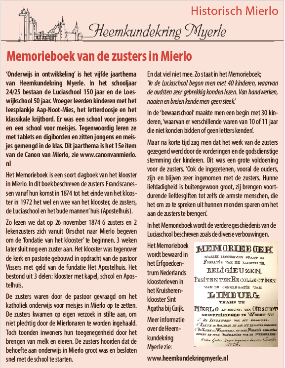 Vandaar dat als jaarthema voor dit jaar gekozen is voor Onderwijs in ontwikkelling. We gaan dat dit jaar doen in samenwerking met de scholen in Mierlo en in het bijzonder met Kindcentrum Pur Sang om dat zij dit jaar vieren dat de scholen Lucia 150 jaar en Loeswijk 50 jaar bestaan. In al die jaren is er veel veranderd. Niet alleen de naam en de locatie maar vooral ook de onderwijsdeelname en de wijze waarop onderwijs wordt gegeven. We zullen daar in 2025 zeker op terugkijken.