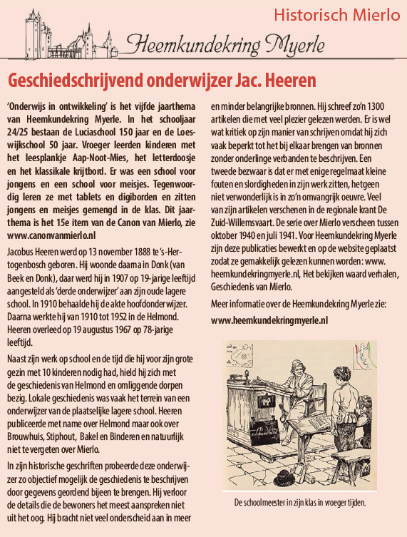 | 17 juni | Lezing over het onderwijs in Mierlo door Corry Bombeeck en Eveline van der Linden ('t Mierles Huukske) | ||||